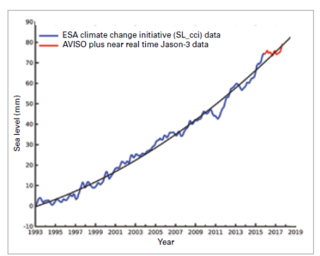 Повышение уровня моря составило 3,7 мм по сравнению с 2017 годом, что стало самым высоким за всю историю наблюдений, по сравнению со средним показателем в 3,1 мм ежегодно в период с 1992 по 2018 год. Уровень моря сегодня примерно на 8 см выше, чем в 1993 году. Предполагается, что скорость подъема уровня моря в последние годы составляла около 0,1 мм в год.
